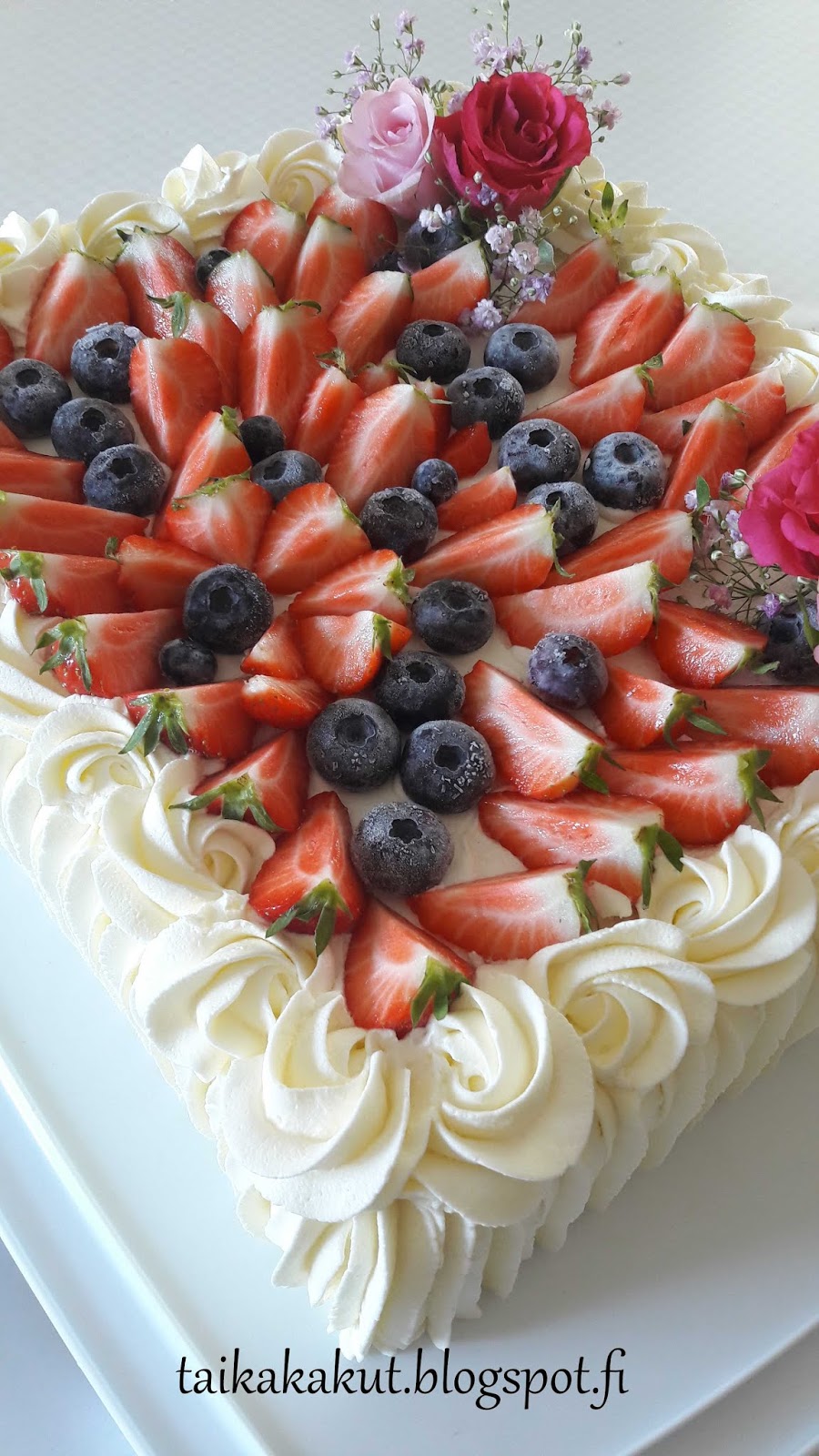 Tein alkuviikolla 15 hengen täytekakun ja voileipäkakun tädilleni. Lisäksi tein vielä kinuskikeksejä joiden ohje löytyy täältä. Täytekakkuun tein 4 munan 24cm gluteenittoman sokerikakkupohjan. Gluteeniton pohja on niin höttöistä etten kostuttanut sitä ollenkaan. Väliin tuli mansikkahilloa ja kermavaahtoa. Päälle pursotukset ja kotimaisia pensasmustikoita, vadelmia ja mustikoita. Voileipäkakun tein tällä ohjeella, mutta pienensin sitä 24cm vuokaan sopivaksi.